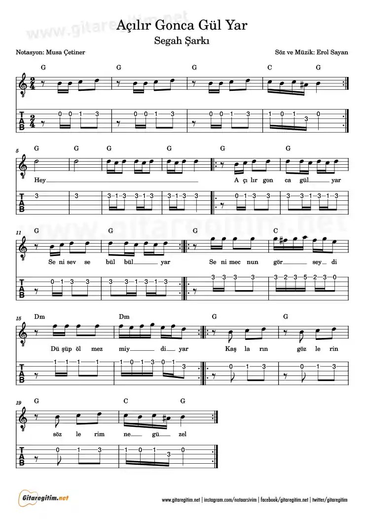 Açılır Gonca Gül Yar, Segah makamında, söz ve müziği Erol Sayan’a ait olan bir şarkı. Günümüze kadar çok sayıda sanatçı tarafından yorumlanmış. Si karar sesinde notaya aldım. Pdf ve imaj biçiminde görüntüleyebilir, dinleyerek doğru bir şekilde çalışabilirsiniz.