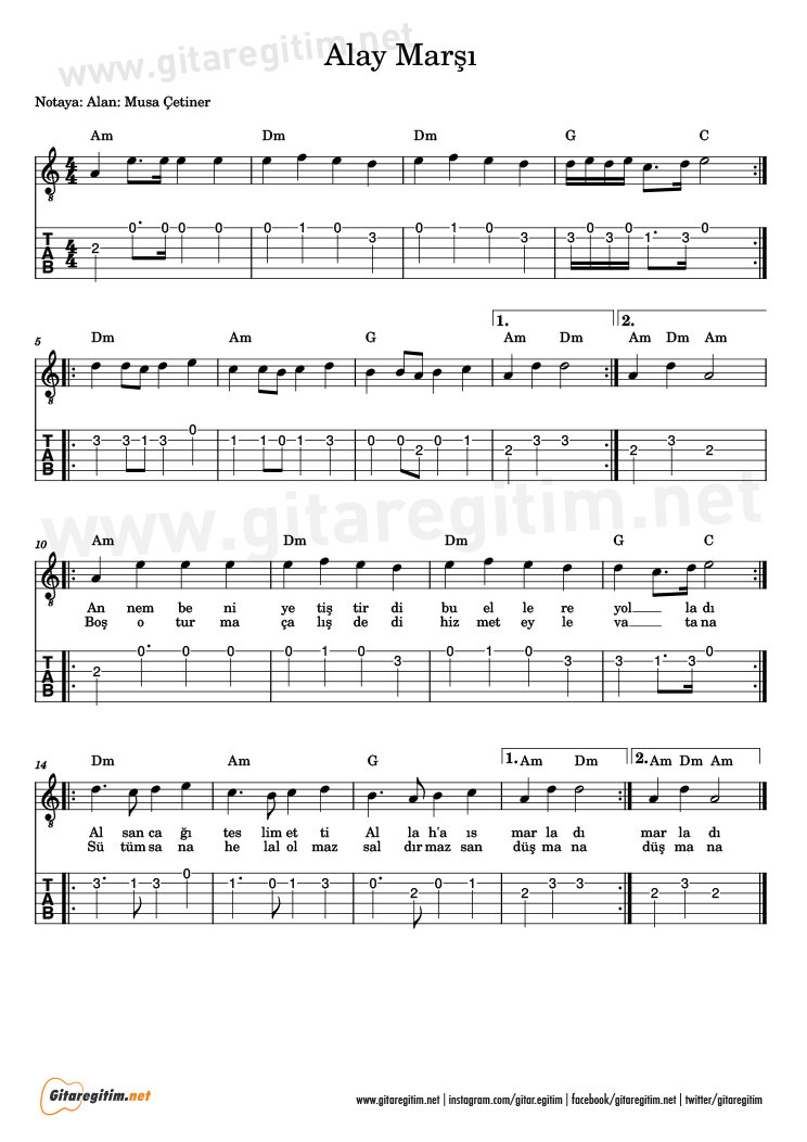 Alay Marşı, Annem Beni Yetiştirdi, Gitar Nota ve Tab. Nihavend makamında ve adından da anlaşılacağı üzere marş formunda bir şarkı. Aynı isimde başka bir marş da var. La karar sesinde notaya aldım. PDF ve imaj biçimlerinde görebilir, notasyonu dinleyerek çalışabilirsiniz.