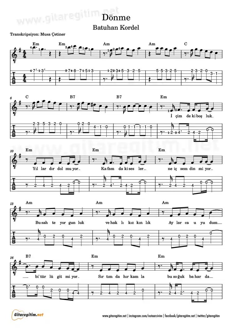 Dönme, Batuhan Kordel’in bir şarkısı. Fa# minör tonunda yorumlanmış, ben Mi minör tonuna transpoze ederek notaya aldım. Notasyonu Pdf ve imaj biçiminde görebilir, tab videosunu izleyerek çalışabilirsiniz.