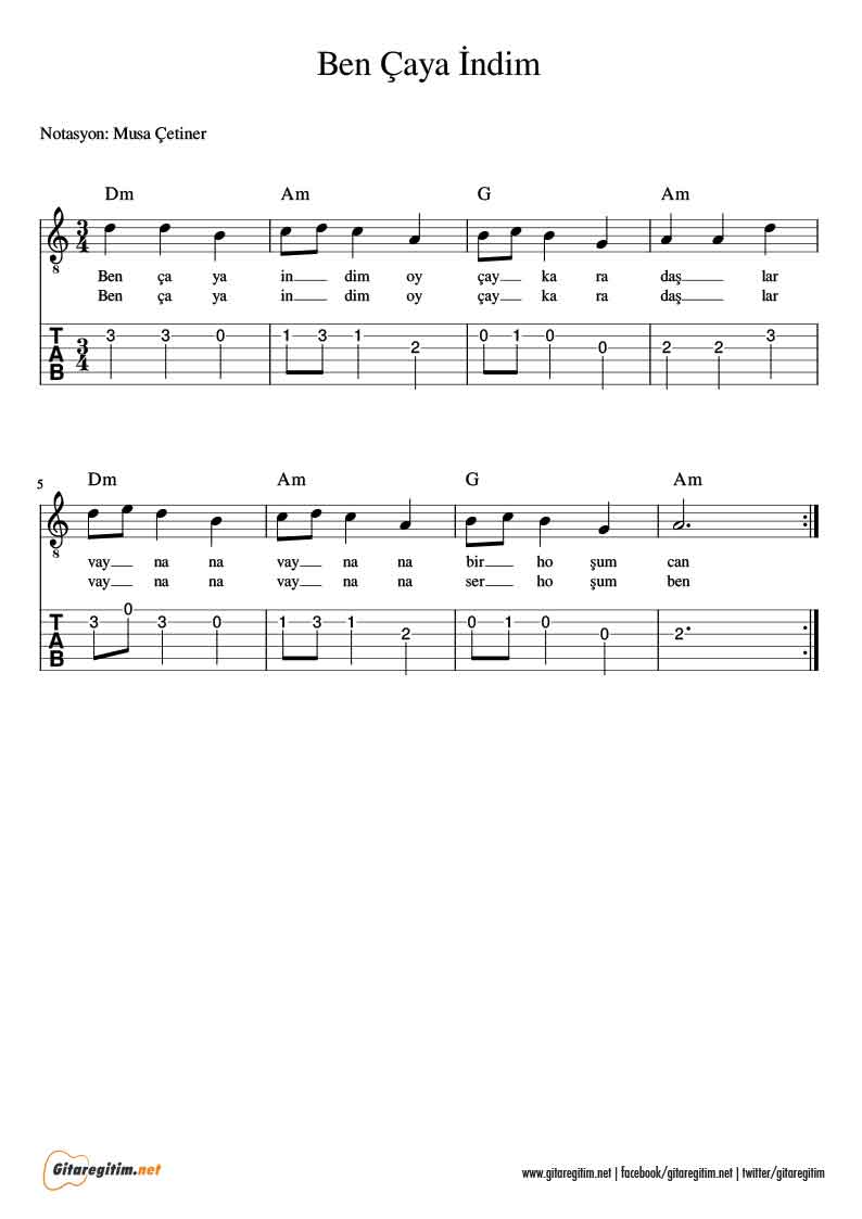 Ben Çaya İndim – Gitar – Nota – Tab