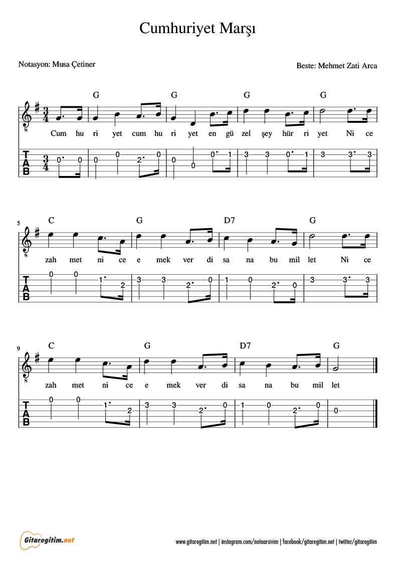 Cumhuriyet Marşı – Gitar – Nota – Tab