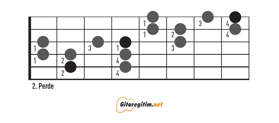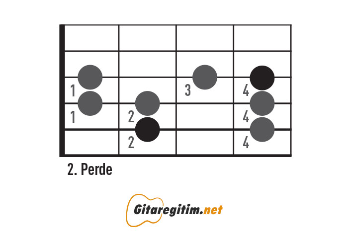 Artık kapalı pozisyona geçiyoruz. Kapalı pozisyon derken hiç boş tel kullanmadığımız yapıdan bahsediyorum. Notalar aynı fakat farklı perdeleri kullanarak çalıyoruz.