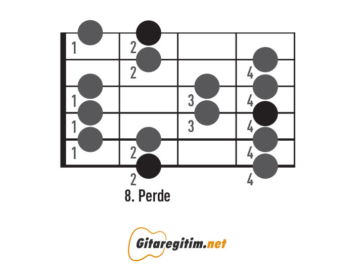 - Kapalı pozisyondaki dizilerin çok önemli bir avantajı var. Bir diziyi kapalı pozisyonda öğrendiğinizde o yapıyı kaydırarak farklı tonlardaki dizileri de çalmış oluyoruz. Aşağıdaki diziyi ezberleyip, aynı yapıyı 3 yerine 5 perdeden çalarsanız Re Majör dizi çalmış olursunuz veya 7 perdeden çalarsanız Mi Majör dizi çalmış olursunuz. Böylelikle her diziyi nota nota ezberlemenize gerek kalmaz.