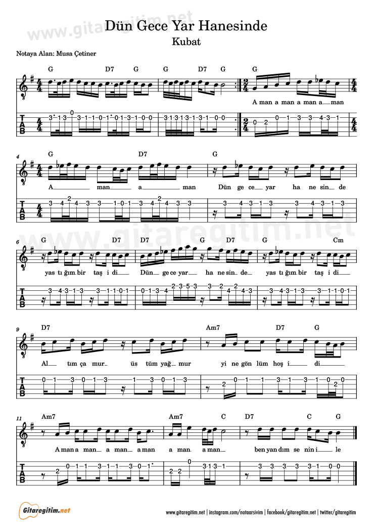Dün Gece Yar Hanesinde Yastığım Bir Taş İdi, Gitar Nota ve Tab. Erzurum yöresine ait bir türkü. Kubat’ın yorumunu dinleyerek notaya aldım. Sanatçının 2000 yılında çıkan “Arşiv – Vol III” albümünde yer almış. Notasyonu dinleyebilir, PDF ve imaj formatında görüntüleyebilirsiniz.