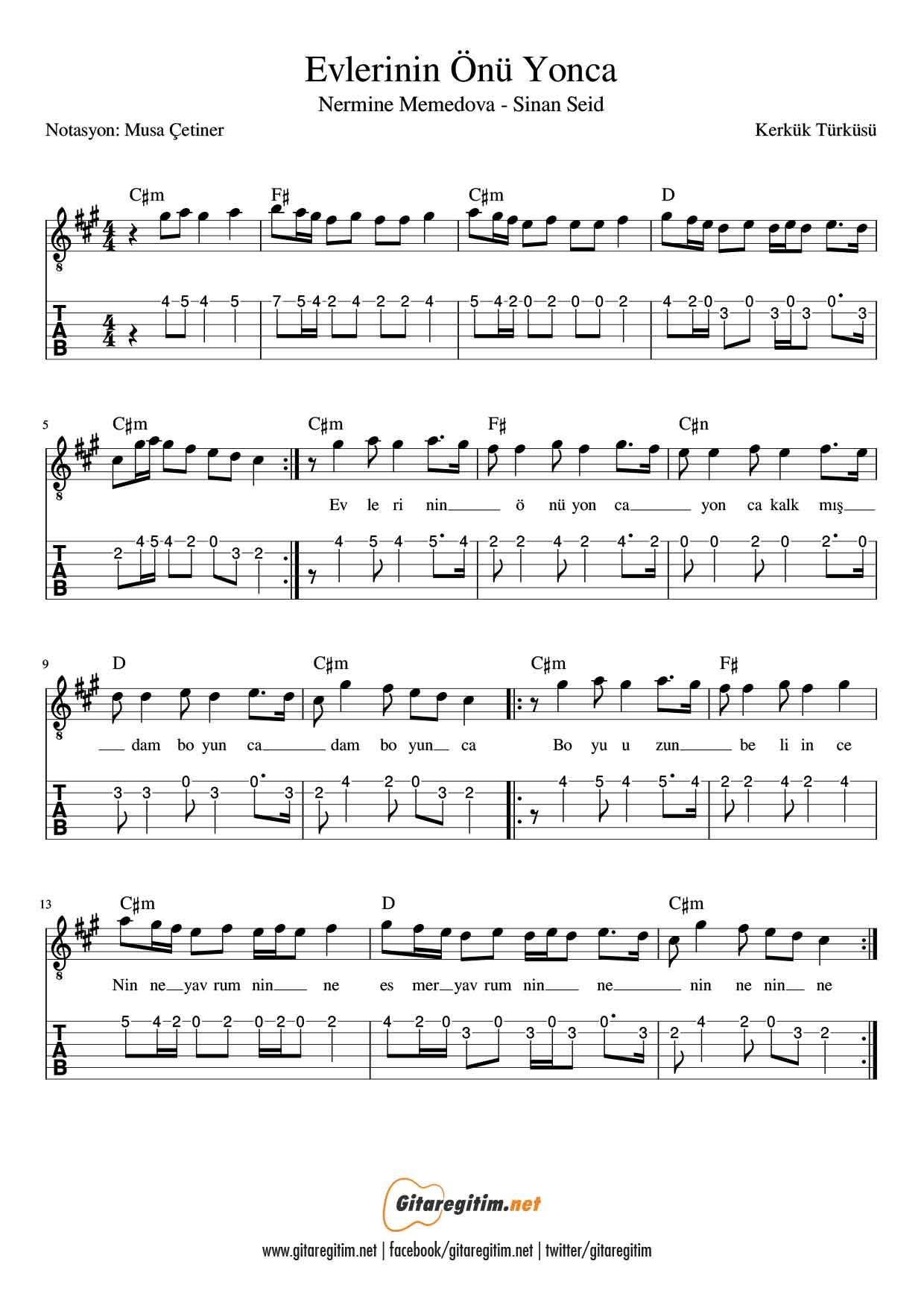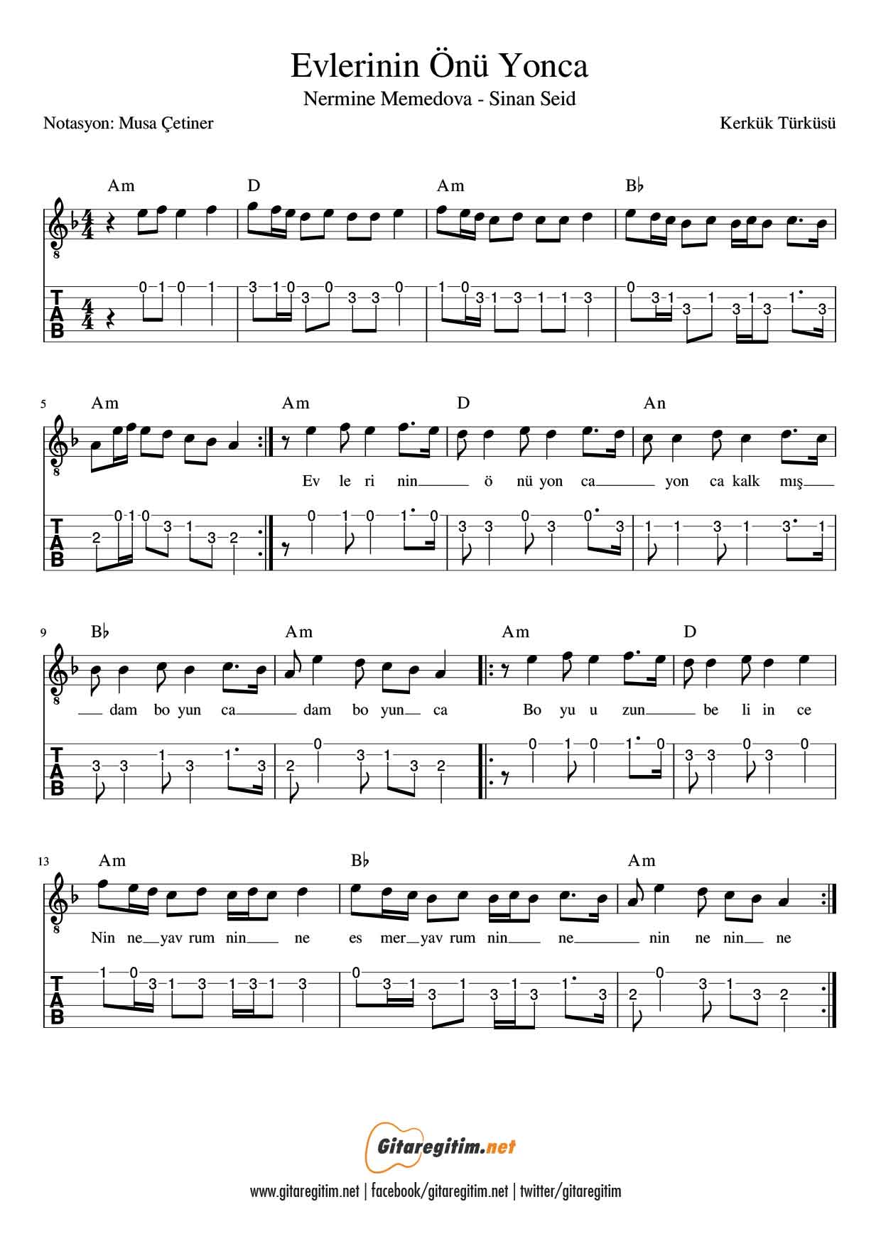 Evlerinin Önü Yonca – Gitar – Nota – Tab