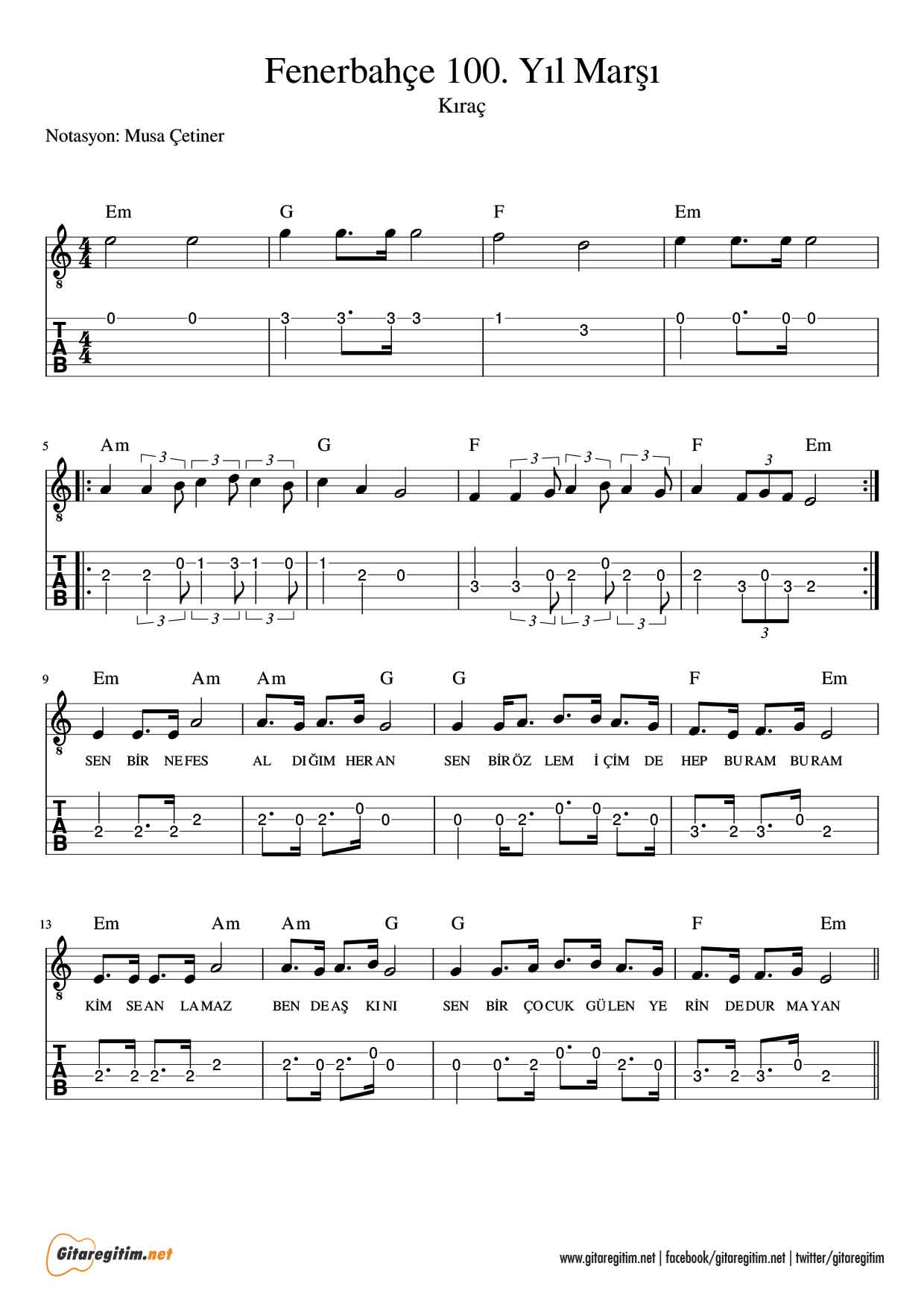 Fenerbahçe 100. Yıl marşının gitar tabı bu yazının konusuydu. Bu şarkıdan sonra “Yaşa Fenerbahçe” şarkısını da çalmak isteyebilirsiniz. Diğer takımların şarkıları için sitede ufak bir araştırma yapmanız yeterli. Teşekkürler.
