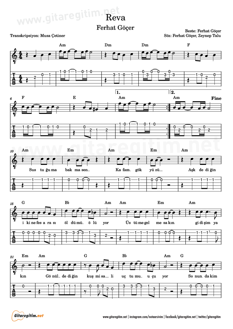 Reva, Ferhat Göçer’in bir şarkısı. Sözü ve müziği kendisine ait, sözler de Zeynep Talu’nun da imzası var. La Minör tonunda bir şarkı, aynı tonda notaya aldım. Pdf ve imaj formatlarında görebilir, notasyonu dinleyerek doğru bir şekilde çalışabilirsiniz.