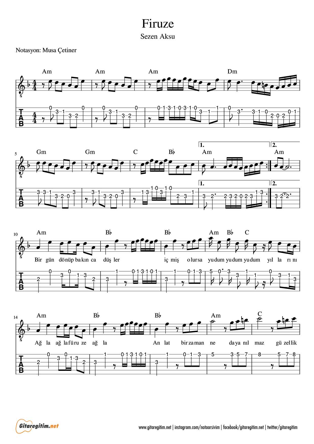 Firuze, Gitar Nota ve Tab. Sezen Aksu’nun bir şarkısı. Bestesi Atilla Özdemiroğlu, sözleri Aysel Gürel ve Sezen Aksu’ya ait. La Karar sesinde notaya aldım. PDF ve Jpg biçiminde görebilir, tab çalınış videosunu izleyerek çalışabilirsiniz.