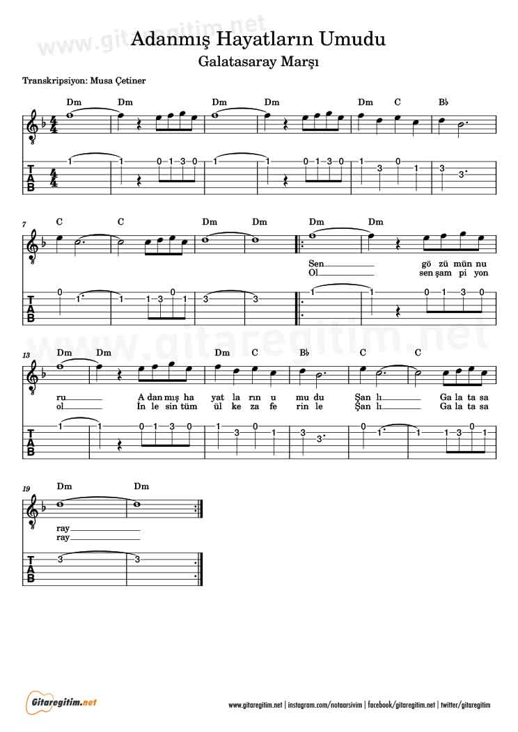 Galatasaray – Adanmış Hayatların Umudu – Gitar Tab