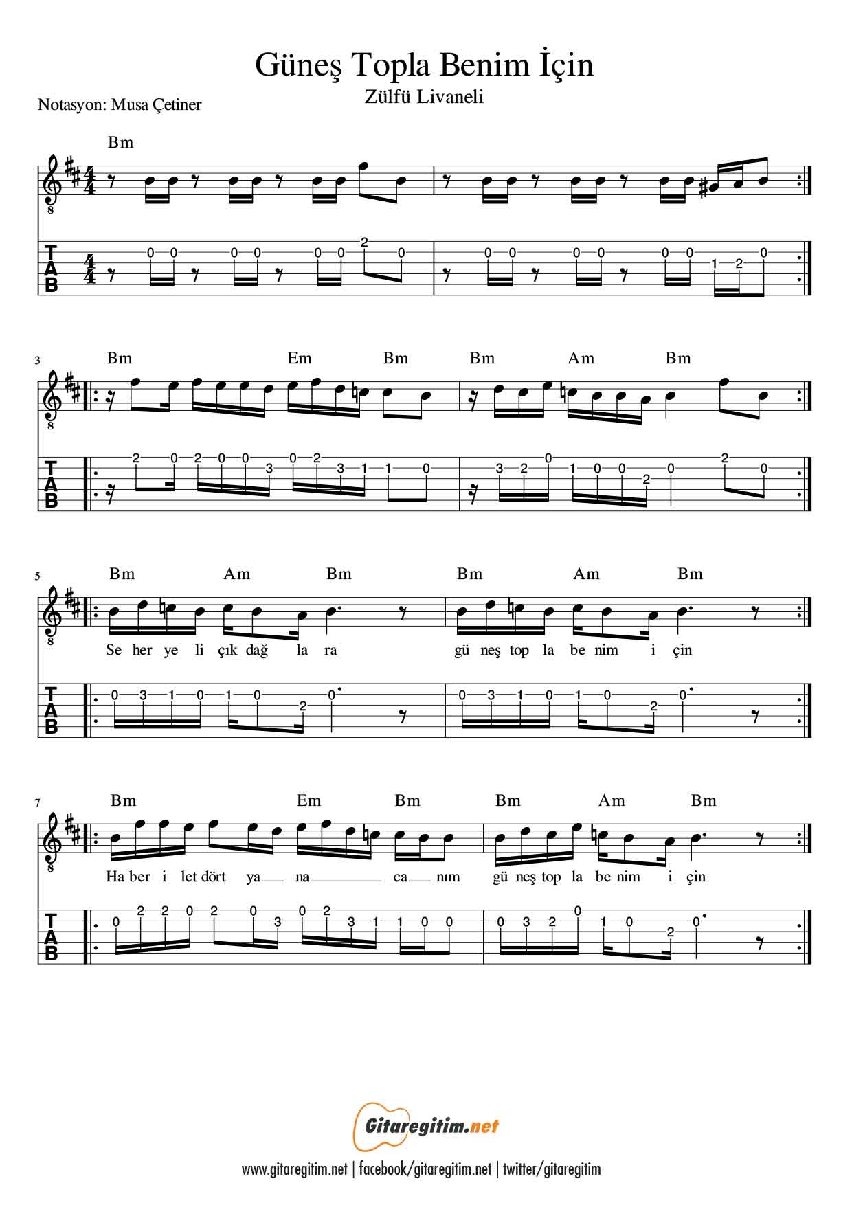 Güneş Topla Benim İçin – Gitar – Nota – Tab