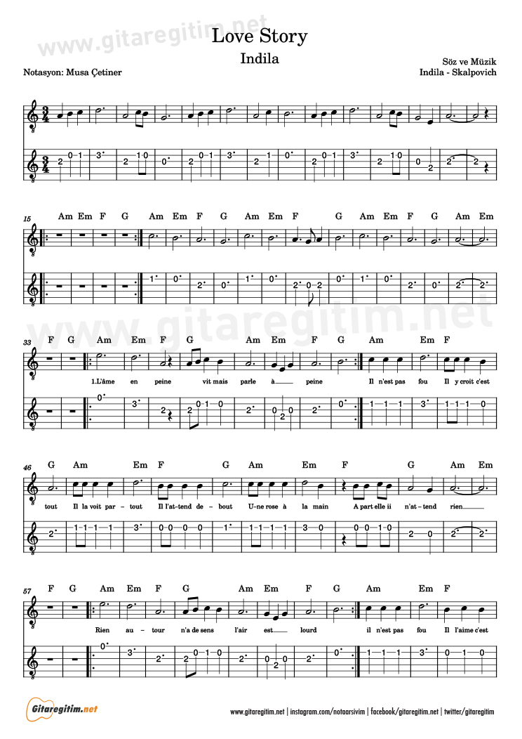 Love Story, Gitar Nota ve Tab. Sözü ve müziği Indila ile Skalpovich’e ait olan ve Indila’nın seslendirdiği bir şarkı. Si bemol minör tonunda yorumlanmış, Ben daha kolay bir çalım için La minör tonunda notaya aldım. Orjinal ton için gitarınızın 1. perdesine kapo takabilirsiniz.