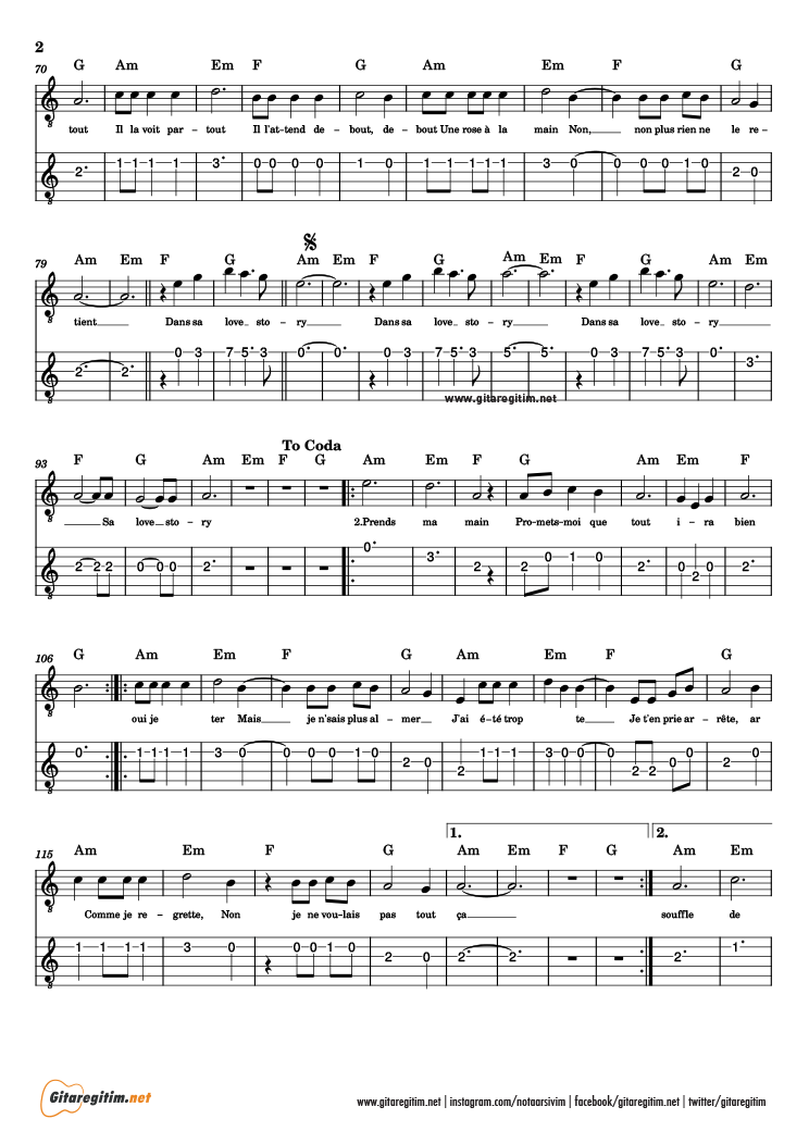 Şarkı Fransızca olduğu için sözleri kontrol edemedim, yanlışlar olabilir. Notasyonu PDF ve imaj biçimlerinde görebilir, dinleyerek doğru bir şekilde çalışabilirsiniz.
