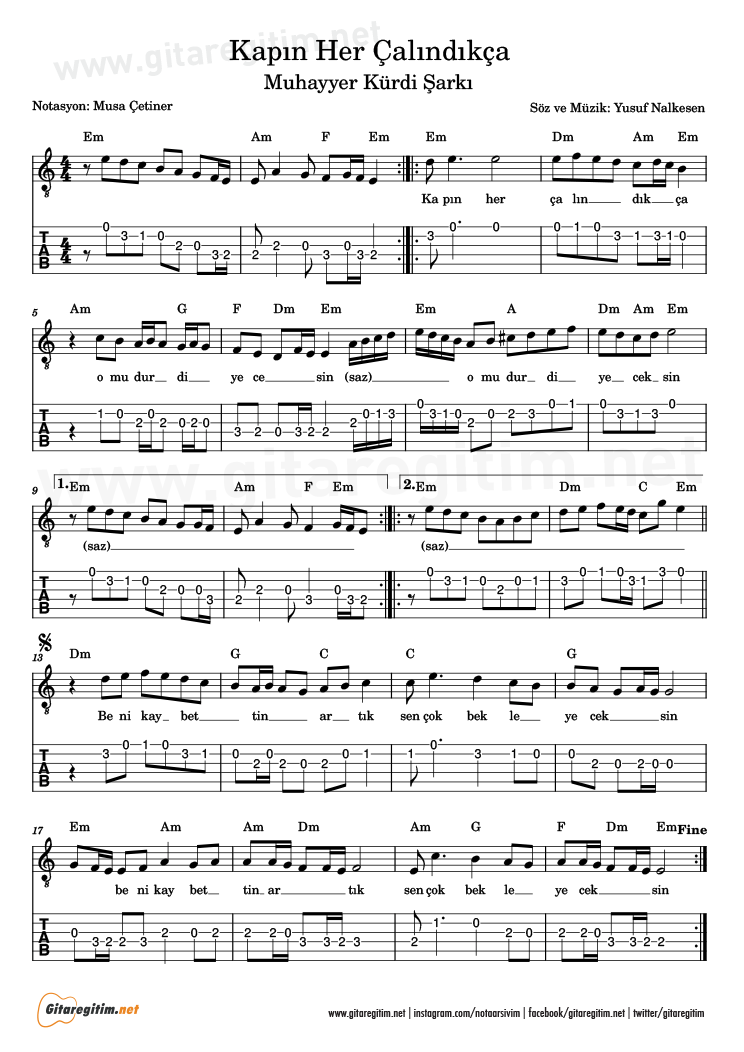 Kapın Her Çalındıkça – Gitar Nota Tab
