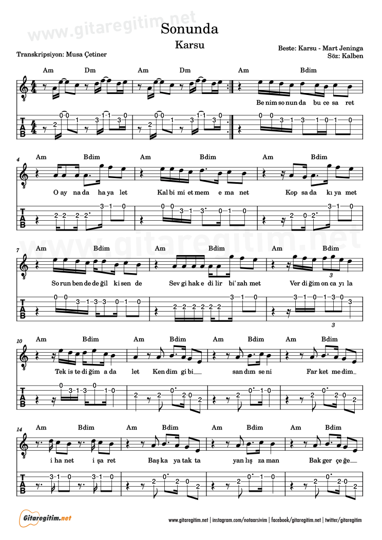 Sonunda Tab. Sözlerini Kalben’in yazdığı, Karsu ve Mart Jeninga’nin bestelediği bir şarkı. La minör tonunda notaya aldığım şarkının orjinal tonu Sol Minör. PDF ve imaj formatlarında görebilir, notasyonu dinleyerek doğru bir şekilde çalışabilirsiniz.
