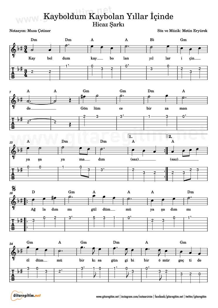 Kayboldum Kaybolan Yıllar İçinde – Gitar Tab