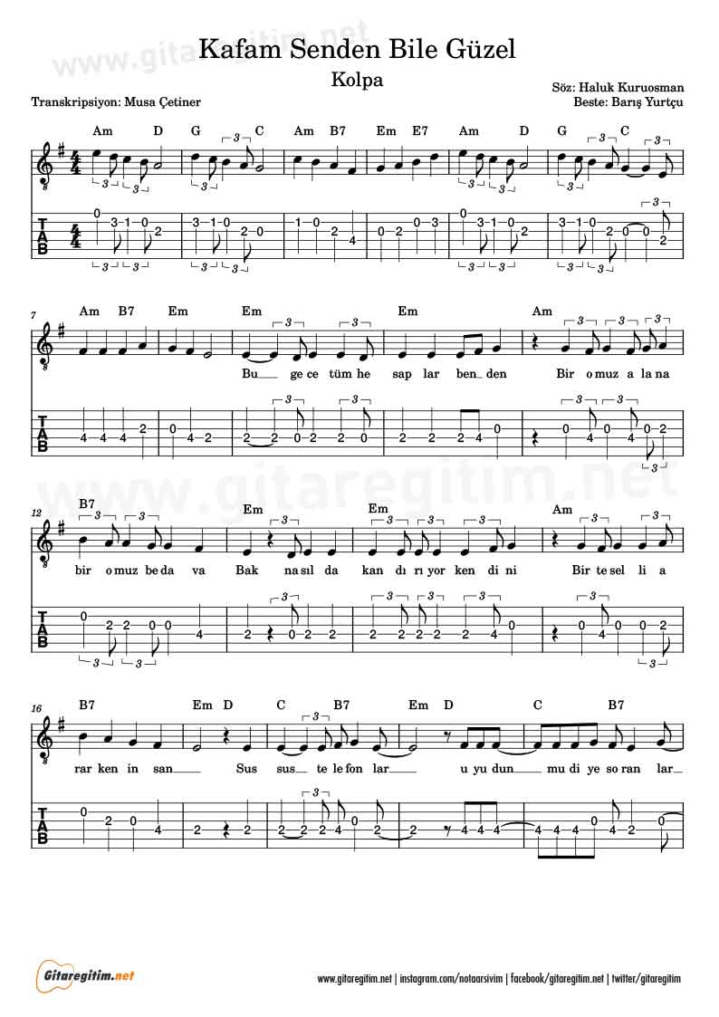 Kafam Senden Bile Güzel; Kolpa grubunun bir şarkısı. Sözleri Haluk Kuruosman, bestesi Barış Yurtçu’ya ait. Grubun 2014 yılında çıkan “Aşk ve Hayat Tadında” albümünde yer almış. Mi minör tonunda yorumlanmış, aynı tonda notaya aldım. Pdf ve Jpg formatında görüntüleyebilir, notasyonu dinleyerek çalışabilirsiniz.