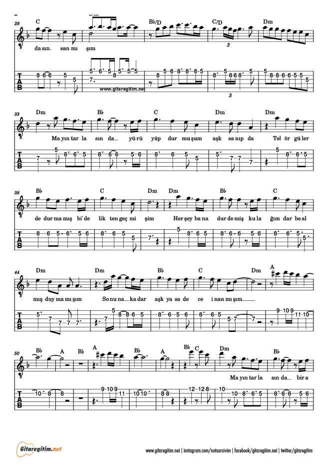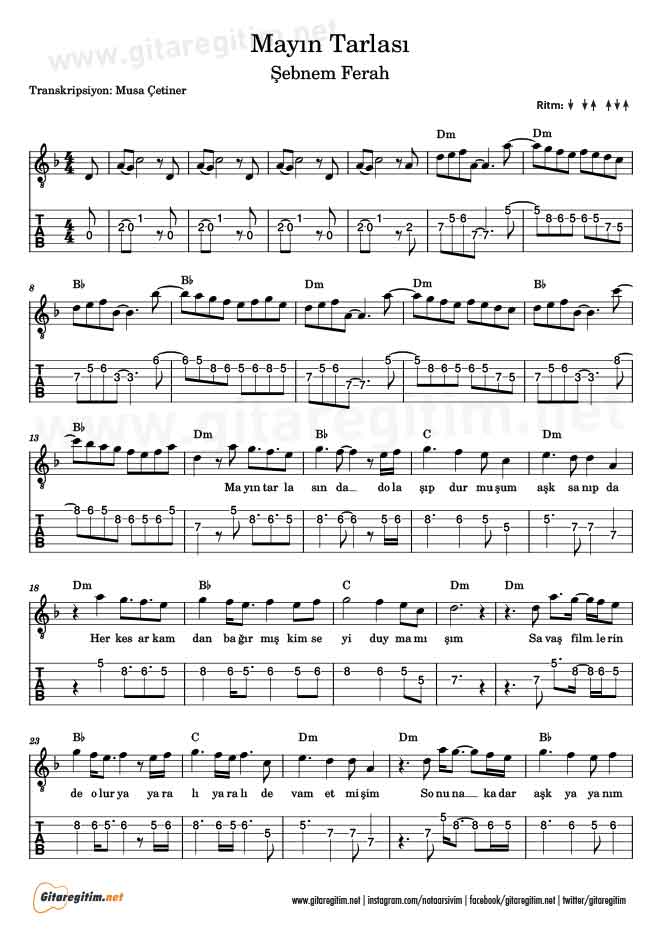 Mayın Tarlası Nota Tab. Şebnem Ferah’ın bir şarkısı. Sözü ve müziği sanatçıya ait. Şarkı 2003 yılında çıkan “Kelimeler Yetse…” albümünde yer almış. Re Minör tonunda yorumlanmış, aynı tonda notaya aldım. Pdf ve Jpg biçiminde görüp, notasyonu dinleyerek çalışabilirsiniz.