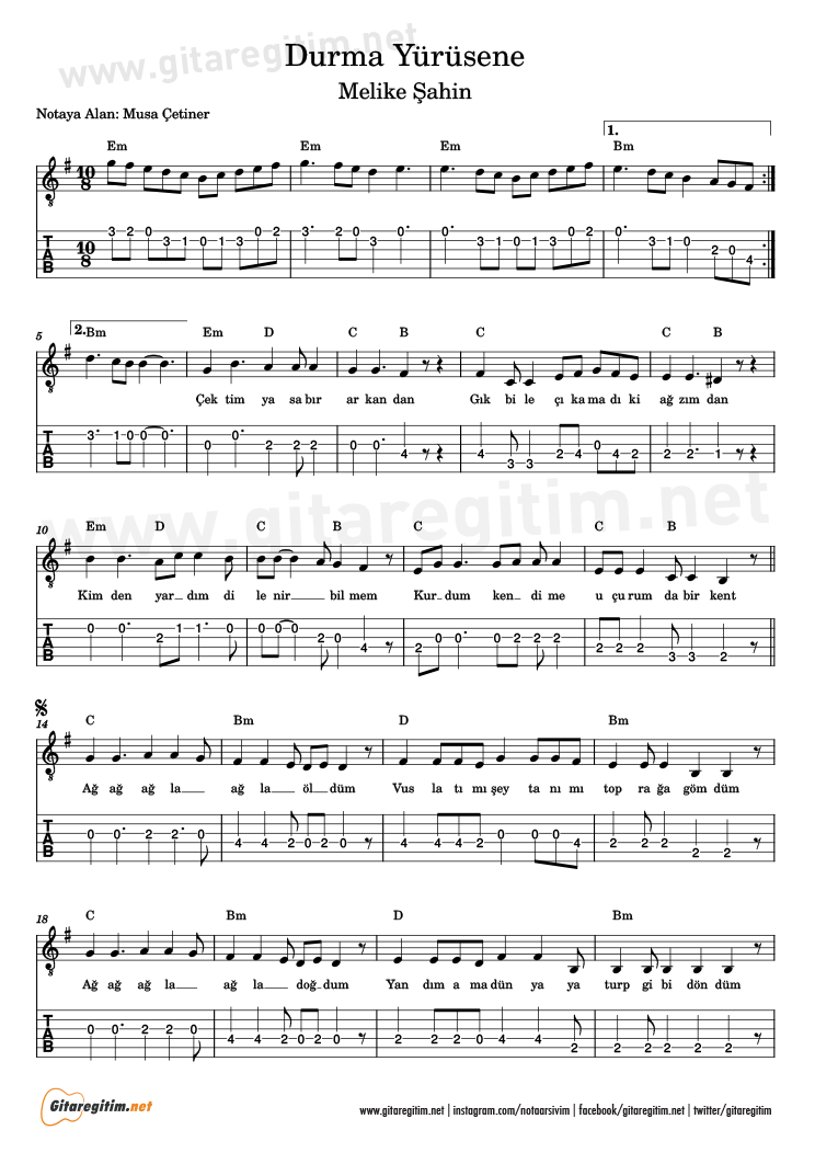 Durma Yürüsene, Gitar Nota ve Tab. Sözü ve müziği Melike Şahin’e ait bir şarkı. 10/8 ölçü biriminde bestelenmiş. Fa Karar sesinde yorumlanmış, ben Mi karar sesinde notaya aldım. Gitarınızın 1 perdesine kapo takarak orjinal tonda çalabilirsiniz. Notasyonu dinleyebilir, PDF ve imaj biçiminde görüntüleyebilirsiniz