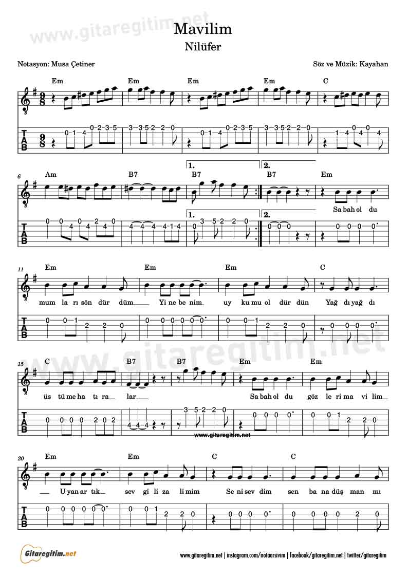 Nilüfer’in Mavilim şarkısı bu yazının konusuydu. Sanatçının diğer notalarına ulaşmak için arama bölümüne ismini yazmanız yeterli. Yeni eklenen tablardan ve yazılardan haberdar olmak için siteye mail abonesi olabilirsiniz. Teşekkürler.