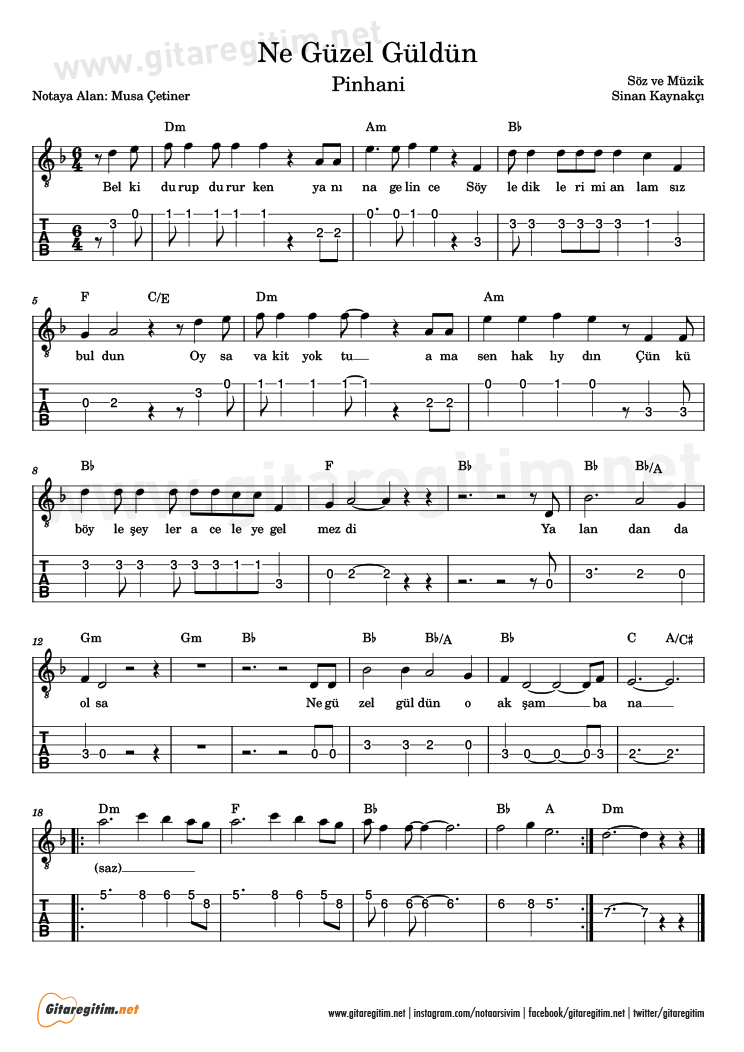Ne Güzel Güldün, Gitar Nota ve Tab. Sözü ve müziği grubun solisti Sinan Kaynakçı’ya ait olan, Pinhani grubunun bir şarkısı. Re minör tonunda yorumlanmış, aynı tonda notaya aldım. Daha kolay çalabilmeniz için 6/4 ölçü biriminde yazdım.