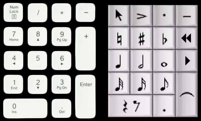 Hangi tuşun neye karşılık geldiğini aşağıdaki görsel sayesinde daha iyi görebiliyoruz. Num Lock tuşu ok işaretine karşılık geliyor ama onu kullanmıyoruz, onun dışındakileri kullanacağız. Tuşlara basarak Keypad penceresindeki değişimleri inceleyiniz. Sürelere karşılık gelen tuşlara bastığınızda nota yazma durumuna geçersiniz. Fare işaretçisinin mavi renge dönüşmesinden bunu anlayabiliriz.