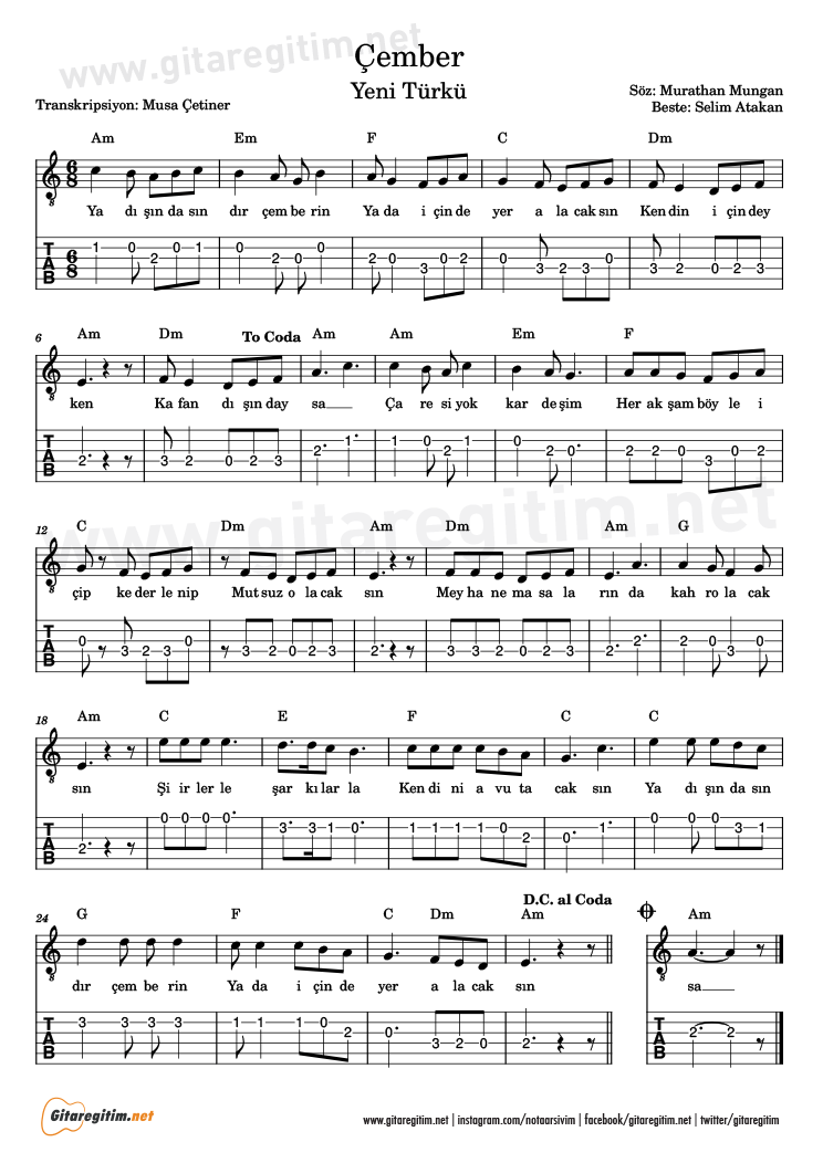 Çember, Gitar Tab. Yeni Türkü grubunun bir şarkısı. Sözleri Murathan Mungan, bestesi Selim Atakan’a ait. Sol# minör tonunda yorumlanmış, Ben la minör tonunda notaya aldım. PDF ve imaj biçimlerinde görebilir, notasyonu dinleyebilirsiniz.